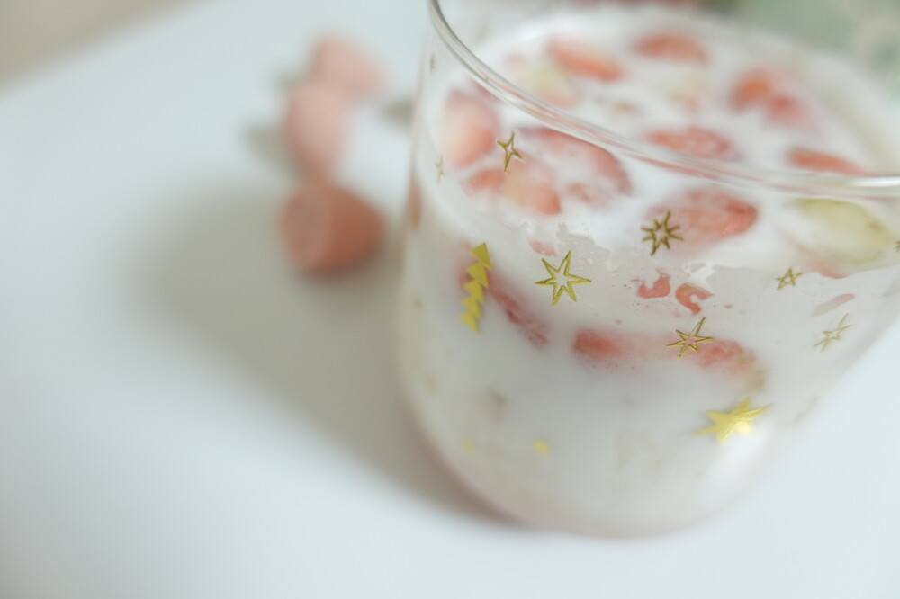 예쁜 유리컵에 만년설딸기청을 넣어주세요.