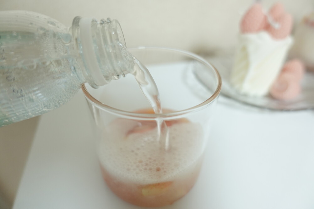 만년설딸기라떼와 동일하게 예쁜잔에 딸기청을 먼저 넣은 후 탄산수를 부으면 초간단 완성 !